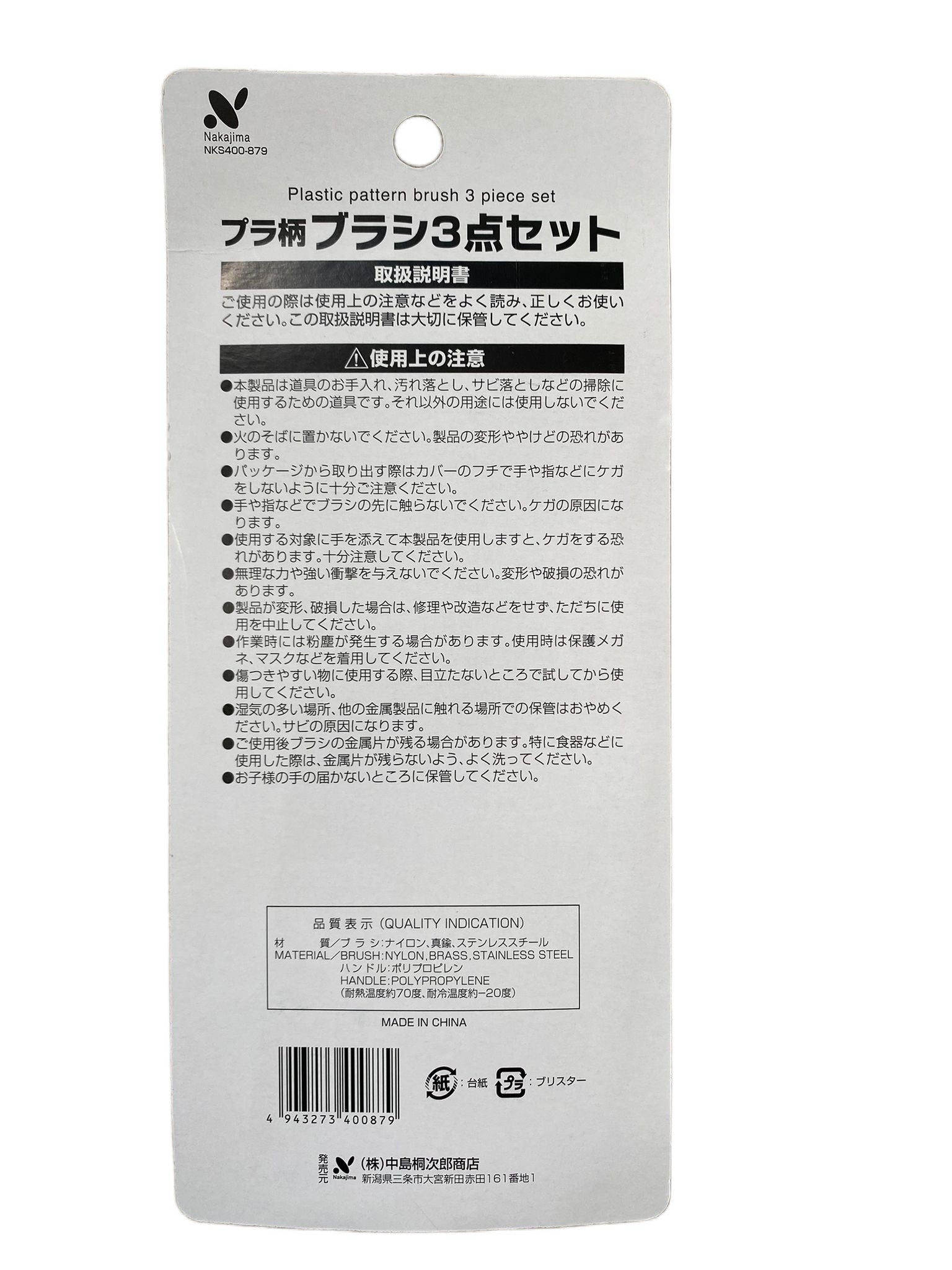 Handle - Polypropylene, Brush part - Nylon, brass, stainless steel.